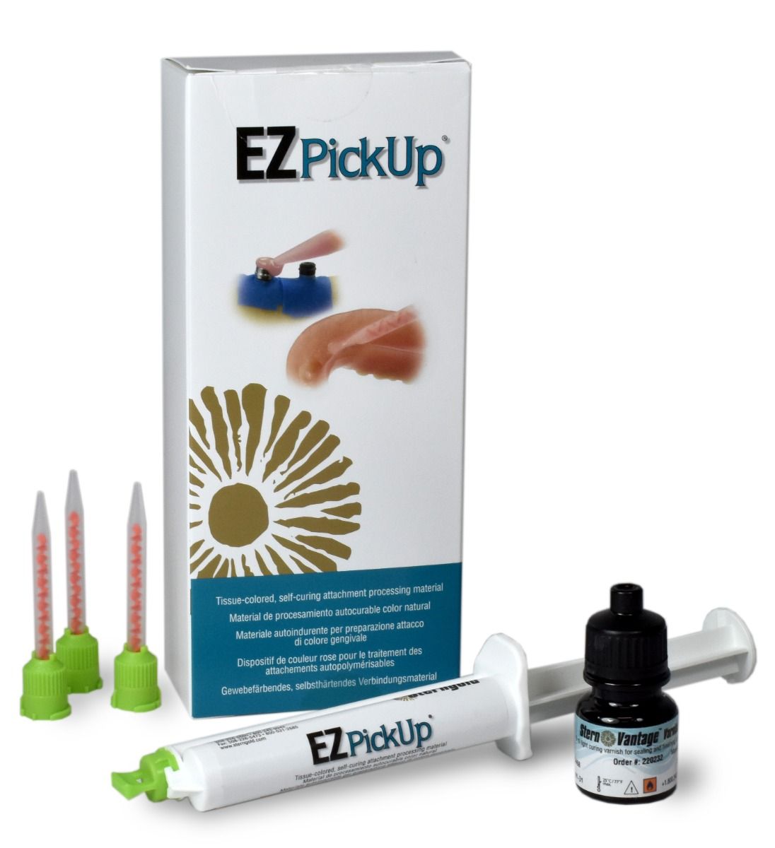Tissue-colored, automixing, self-curing attachment processing material.  Contains: 1 syringe @ 15 grams, 15 Tips, and 5.0ml Varnish.